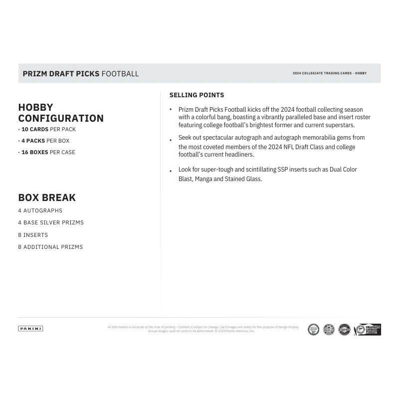 •  Prizm Draft Picks Football kicks off the 2024 football collecting season with a colorful bang, boasting a vibrantly paralleled base and insert roster featuring college football’s brightest former and current superstars.