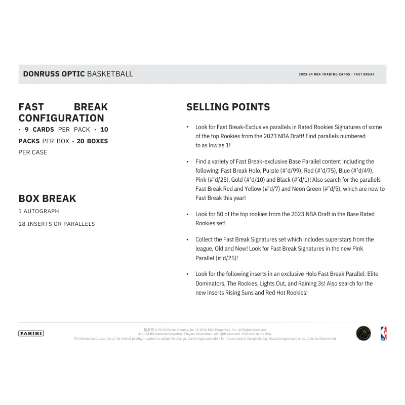 • Look for the following inserts in an exclusive Holo Fast Break Parallel: Elite Dominators, The Rookies, Lights Out, and Raining 3s! Also search for the new inserts Rising Suns and Red Hot Rookies!
