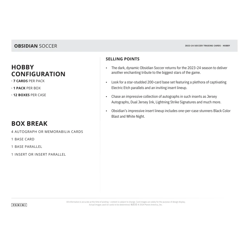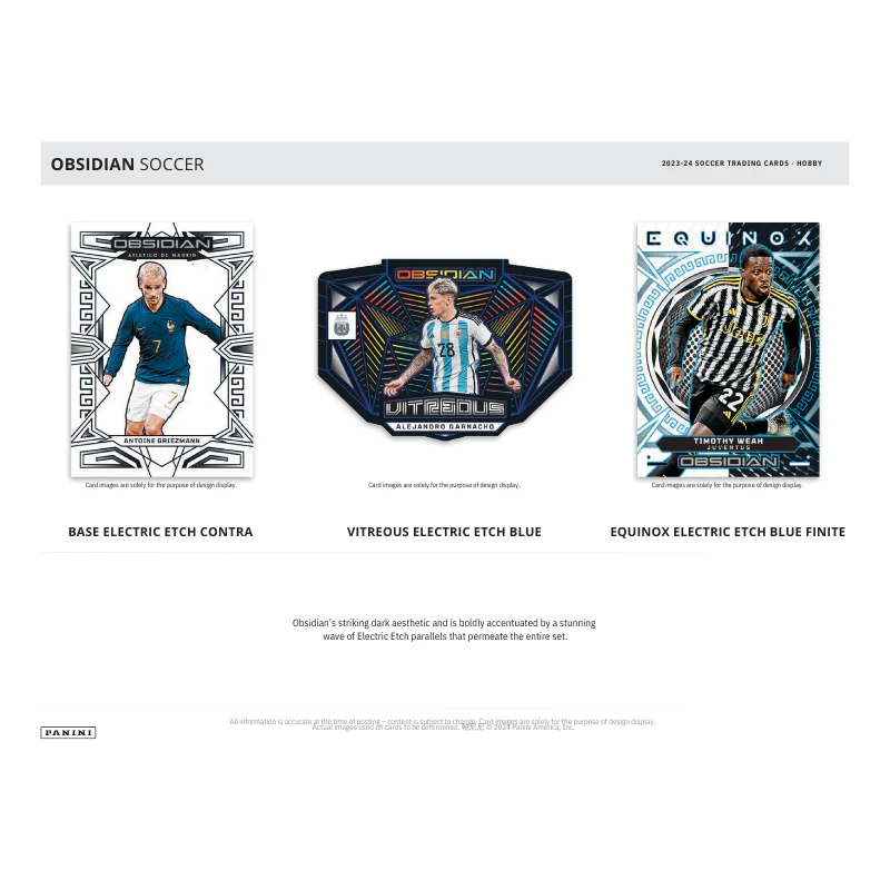 The 2023/24 Panini Obsidian Soccer Hobby Box delivers a premium experience for soccer card collectors, showcasing top players and teams from leagues around the world. Known for its sleek, volcanic design and electric etching, Obsidian offers a mix of stunning base cards, rare parallels, and sought-after autographs. Each box includes seven cards, with a chance to pull autos, patch autographs, and vibrant inserts like Color Blast and Contra parallels. With limited production and a focus on sharp detail, the 2023/24 Obsidian Soccer Hobby Box is perfect for those looking to add high-end soccer cards to their collection.